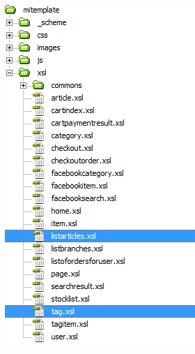 Los listados de artículos se representan a través de un archivo llamado listarticles.xsl , o de un archivo llamado tag.xsl (si se los están filtrando por tag), ubicados en la carpeta xsl del directorio correspondiente al template en desarrollo.