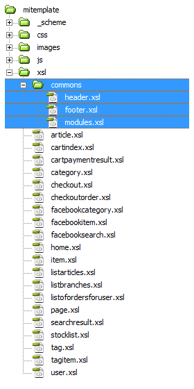 En este ejemplo, los tres archivos a ser incluídos están ubicados en una carpeta llamada commons creada dentro de la carpeta xsl del template.